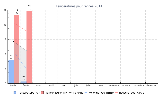 | janvier | 4.7 °C | 6.4 °C | 14.0 °C | 12.4 °C | 8.5 °C | 7.6 km/h | 41.8 km/h | SSE |