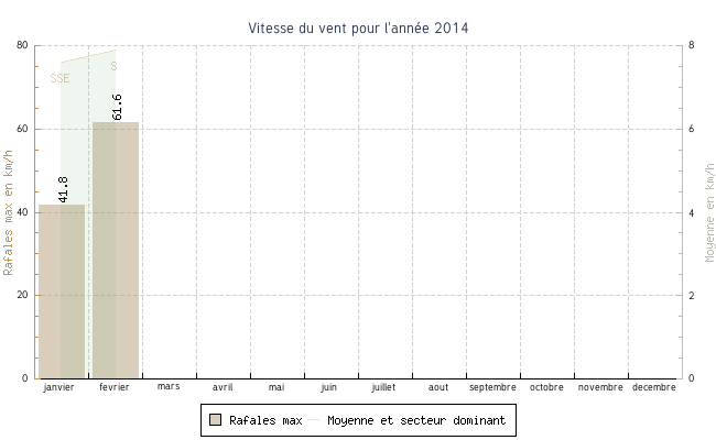 | fevrier | 0.4 °C | 2.9 °C | 14.8 °C | 10.7 °C | 6.7 °C | 7.9 km/h | 61.6 km/h | S |