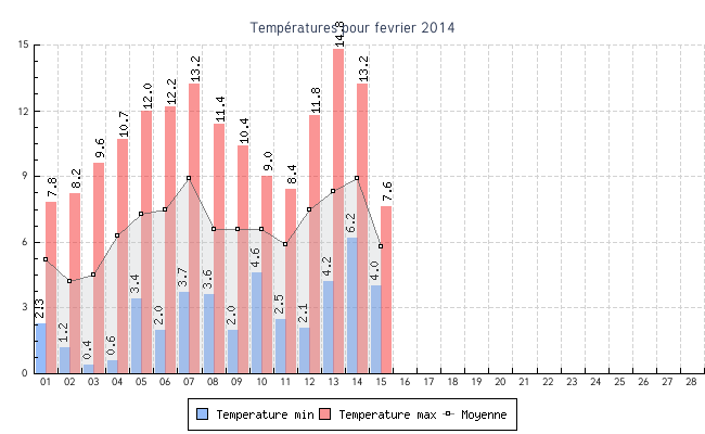 | 14 | 6.2 °C | 13.2 °C | 8.9 °C | 6.9 km/h (28.8 km/h) | ESE |